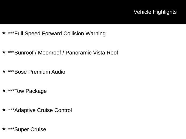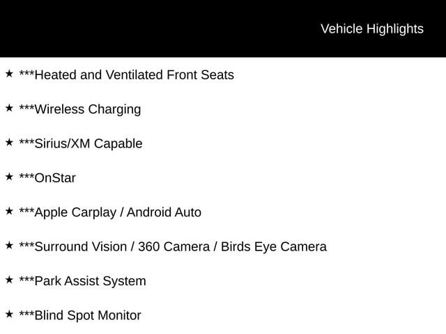 ***Heated and Ventilated Front Seats, ***Wireless Charging, ***Sirius/XM Capable, ***OnStar, ***Apple Carplay / Android Auto, ***HD Surround Vision, ***Enhanced Automatic Parking Assist, ***Blind Zone Steering Assist , ***Forward Collision Alert, ***Power Panoramic Sunroof, ***Bose Audio System, ***Trailering Package, ***Adaptive Cruise Control, ***Super Cruise. Black